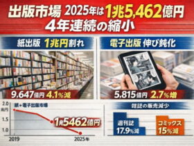 全国出版協会・出版科学研究所は1月26日、2025年(1~12月期累計)の出版市場規模を発表した。紙と電子を合算した推定販売金額は前年比1.6%減の1兆5,…