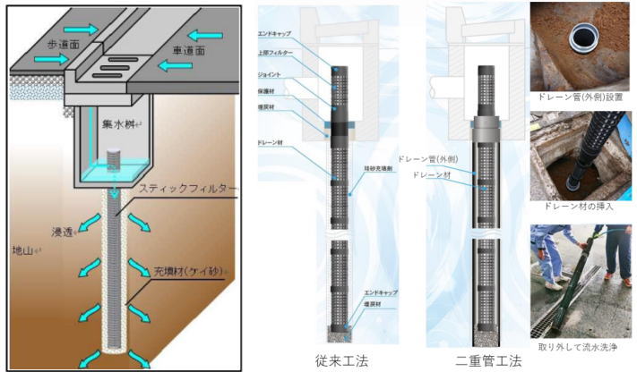 採択された新型技術は、既存のドレーン管の外側に新たなドレーン管を設置して二重管とし、埋設後でも内側のスティックフィルターを取り外すことで洗浄や取り換えが可能となる。これにより施工工期の短縮と維持管理の容易化を目指す。