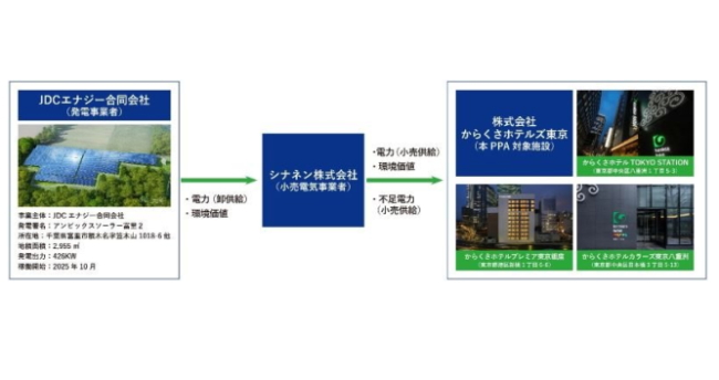 供給対象となる施設は、株式会社ザイマックスグループの子会社である株式会社からくさホテルズ東京(東京都港区)が運営する「からくさホテルプレミア東京銀座」「からくさホテルTOKYO STATION」「からくさホテルカラーズ東京八重洲」の3ホテルである。これらのホテルに供給される電力は、日本国土開発株式会社(東京都港区)の子会社であるJDCエナジー合同会社が千葉県富里市に新設した太陽光発電所から調達される。発電された電力は、送配電網を通じて各ホテルへ供給される仕組みとなっている。