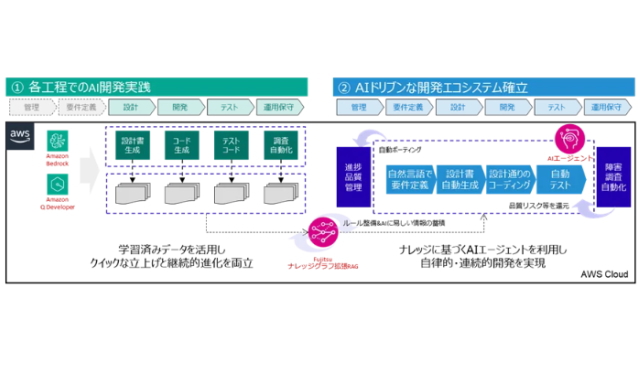 今回の取り組みでは、富士通独自の「ナレッジグラフ拡張RAG」技術を活用し、開発・テスト領域から生成AIの適用を段階的に拡大。保有データの関係性を可視化・構造化することで、AIの精度向上と開発プロセスの効率化を図る。将来的には、要件定義から運用保守までを含む全工程へのAI適用により、開発期間の20%短縮や高いスケーラビリティ・セキュリティの実現を目指す。AWSとの連携により、迅速な開発サイクルと継続的な品質向上を可能とする。