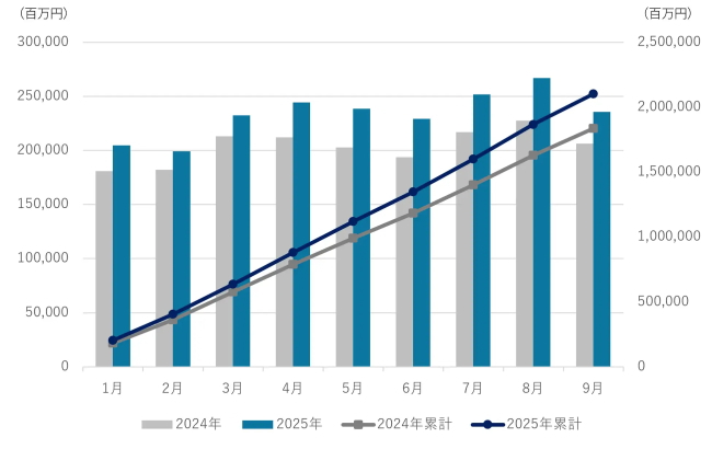 流通金額拡大の背景には、訪日外国人客の増加による外食需要の回復、原材料高や人手不足を受けた業務効率化ニーズの高まりがある。2025年1~9月の訪日外国人数は約3,165万人と過去最速で3,000万人を超え、インバウンド消費額も2兆1,310億円と前年同期比11.1%増となった。こうした外食需要の持ち直しとDX推進により、買い手企業4,258社、売り手企業47,714社、合計51,972社が利用しており、利用企業数の拡大が取引額の増加を後押しした。