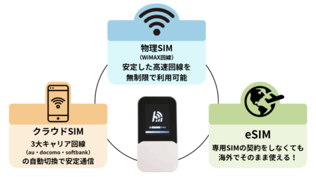 物理SIM(WiMAX回線)/クラウドSIM/eSIMに対応し、利用場所や環境に応じて最適なネットワークを自動選択する。クラウドSIM機能により電波状況やキャリア混雑に合わせた回線選択が可能であり、eSIM対応により海外でも迅速に接続できる。従来のWiMAX端末では難しかった複数回線の切替や海外利用にも対応し、SIMカード交換不要で国内外問わず快適な通信を実現する。
