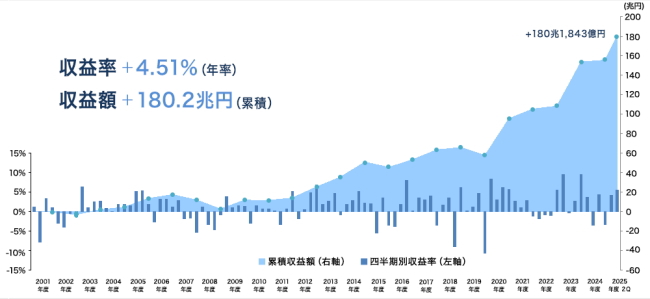 年金積立金管理運用独立行政法人(GPIF)は11月7日、2025年度第2四半期(7~9月)の運用状況速報を公表した。期間収益率は5.52%、収益額は14兆4477億円となり、運用資産額は277兆6147億円に拡大した。市場運用開始の2001年度以降の累積収益額は180兆1843億円に達し、利子・配当収入は累計で58兆6928億円となった。第2四半期は国内外株式の上昇と円安が収益に寄与した。