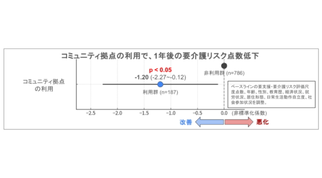 同研究は、奈良県生駒市および福岡県大刀洗町の3地区に居住する65歳以上の高齢者973人を対象に、導入前後1年間の自記式郵送調査を実施したものである。調査の結果、MEGURU STATIONの利用者は非利用者に比べ、要介護リスク点数が平均で1.2ポイント低く、将来的な要介護認定リスクが約15%低下する可能性があることが明らかとなった。
