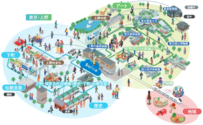 JR東日本は、アートの力を活かして人と人をつなぐ仕組みを強化する。猪熊弦一郎(自由)や平山郁夫(昭和六十年春 ふる里・日本の華)など歴史的作品の修復を進めるとともに、東京藝術大学との包括連携のもと、アートツアーや多言語対応サインを整備する。さらに、クラウドファンディングを活用してアーティストと支援者を結び、持続的な文化創造エコシステムを構築する。「PLATFORM13」での映像展示や藝大生とのワークショップを通じて、上野ならではの文化体験を拡充し、東京都美術館など周辺文化施設との連携を深めることで、「上野文化回遊廊」の形成を進める方針である。