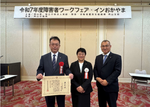 この表彰は、障がいのある方の雇用促進と職場定着に顕著な功績を挙げた事業所をたたえるものである。岡山工場では、障がいの特性に応じた業務設計や職場環境の整備、きめ細かなサポート体制の構築に取り組むとともに、「職場適応援助者(ジョブコーチ)支援」制度を活用するなど、誰もが安心して継続的に働ける職場づくりを進めてきた。今回、津山障害者就業・生活支援センターから推薦を受け、これらの継続的な取り組みが高く評価され、受賞につながった。