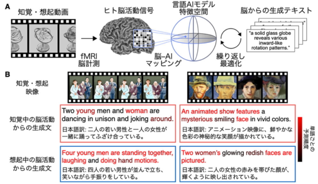 同技術は、fMRIで計測した脳活動を深層言語モデルの特徴空間へ写像し、その特徴に近い語を探索・最適化する「脳‐AI統合型デコーディング」に基づく。動画を観察中の脳活動のみならず、記憶した映像を想起している状態からも、映像内容を反映した構造化テキストを生成することに成功した。100本の候補動画から正しい動画を識別する精度は、観察時約50%、想起時約30%であり、チャンス水準1%を大幅に上回った。さらに、言語処理に関与する脳領域を除外した解析でも高精度を維持し、非言語情報を直接言語化していることが示唆された。