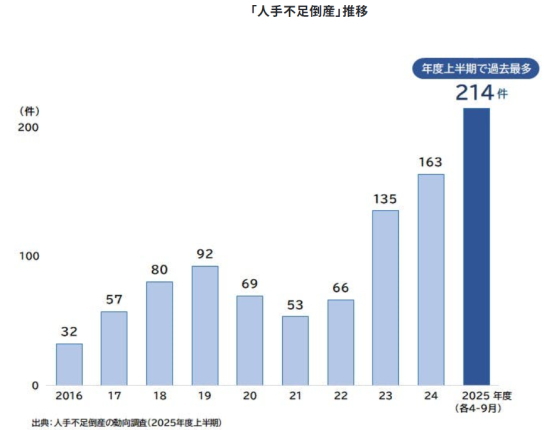 一方で、人手不足を要因とする「人手不足倒産」は増加が続く。2025年度上期(4~9月)は214件と、上期として3年連続で過去最多を更新したうえ、25年1~10月累計は359件に達し、すでに24年通年の342件を上回った。若手人材の大企業志向や地方から首都圏への流出、ハイスキル人材の奪い合いにより、地方を中心に正社員の採用環境は厳しさを増しており、正社員不足の高止まりが今後も続く可能性が高いとみられる。(情報提供:日本インタビュ新聞社・株式投資情報編集部)