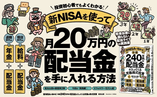 クロスメディアグループ株式会社は11月21日、書籍『新NISAで始める!年間240万円の配当金が入ってくる究極の株式投資』の第10刷重版を発売した。同書は紙と電子を合わせ累計8万部を突破し、Xフォロワー23万人の人気投資家・配当太郎氏が、新NISA制度を活用した年間240万円(月20万円)の配当収入獲得戦略を具体的に示した入門書として支持を広げている。著者は「無期限非課税」の特性を活かし、企業の増配・再投資・追加投資の3要素を組み合わせれば投資額1200万円程度で配当収入240万円に到達できるとし、従来の「6000万円必要」といった定説を覆す点が特徴である。