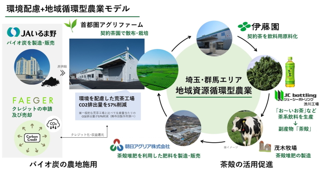 伊藤園は、委託工場から排出される茶殻を群馬県の茂木牧場で堆肥化し、朝日アグリアで肥料に加工、首都圏アグリファームの茶畑で活用する地域循環型スキームを構築した。茶殻排出地と利用地が近接するため輸送負荷も抑えられる。また、JAいるま野が保有する未利用バイオマスを原料にバイオ炭を生成し、伊藤園・フェイガー・首都圏アグリファームが連携して茶畑で散布実証と炭素固定効果のカーボンクレジット化まで一貫して取り組む。さらに、首都圏アグリファームが所有する伊藤園専用荒茶工場は、一般工場比で生産量当たりCO2排出を57%削減しており、環境配慮型工場の特徴も同モデルに加わる。