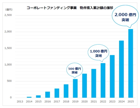 ロードスターキャピタル<3482>(東証プライム)は11月26日、コーポレートファンディング事業における物件購入累計額が2,000億円を突破したと発表した。同事業は東京都23区、特に都心五区を中心に自社資本を用いて不動産を取得・運営し、適切な売却益を確保する同社グループの主力領域である。2013年の事業開始から約12年半での達成となり、累計1,000億円到達から3年で倍増したことは、取得機会の増加と資産形成が安定して進んだ結果といえる。2025年第3四半期末の帳簿価額は917億86百万円に達し、3年間で約2倍に伸長した。