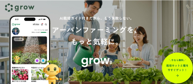 「grow β」は、都市部における家庭菜園を対象に、種まきから収穫、さらには料理に至るまでの一連のプロセスをAIがサポートするものである。ユーザーは、アプリ内のAIキャラクター「ソイリィ」との対話やクイズ形式のクエスト、他ユーザーの栽培日記などを通じて、楽しみながら栽培の知識を深めることができる。