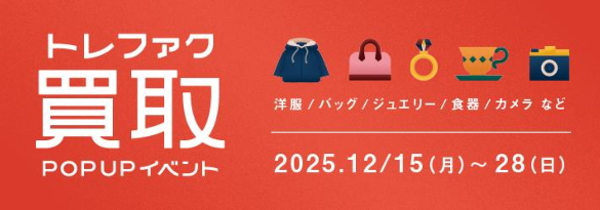 グループ全体で国内外に300店舗以上のリユースショップを展開する、トレジャー・ファクトリー<3093>(東証プライム)は、年末の大掃除需要が高まる時期に合わせ、2025年12月15日(月)から28日(日)までの2週間、北千住マルイにおいて、総合リユース品の買い取りを行う「トレファク買取POPUPイベント」を開催する。