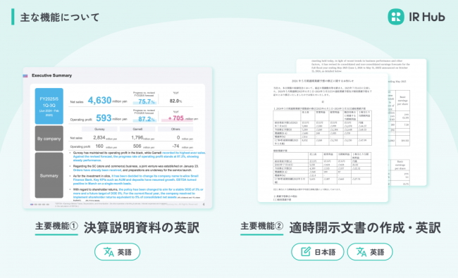 Gunosy<6047>(東証プライム)は12月12日、開示業務支援クラウド「IR Hub」において、決算説明資料の英訳作成時にレイアウトを自動で調整する新機能を正式にリリースした。日本語資料を英訳した際に発生するフォントサイズや配置の手作業調整を自動化し、英文開示業務の生産性向上を図る。