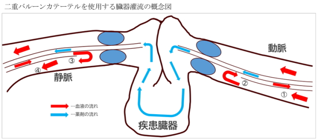 今回権利化された技術は、二重構造のバルーンカテーテルを用い、治療対象臓器の動脈側と静脈側をそれぞれ閉塞することで、体血流とは異なる流体による臓器灌流を可能にする点が特徴だ。医薬品を含む液体を灌流させることで、薬剤を対象臓器のみに選択的かつ正確に送達し、投与後は回収できる。核酸医薬品をはじめ、低分子医薬品や抗体医薬品への応用も可能としている。