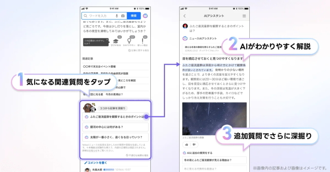 同機能は、生成AIによる利用許諾を得たAIコンテンツパートナーの記事を対象とする。記事下部に表示される関連質問をタップするとチャット画面に遷移し、生成AIが質問内容を解説する。さらに追加質問が提示され、段階的に理解を深められる構成となっている。記事の要点や関連事象を提示することで、情報収集の効率化を図る。