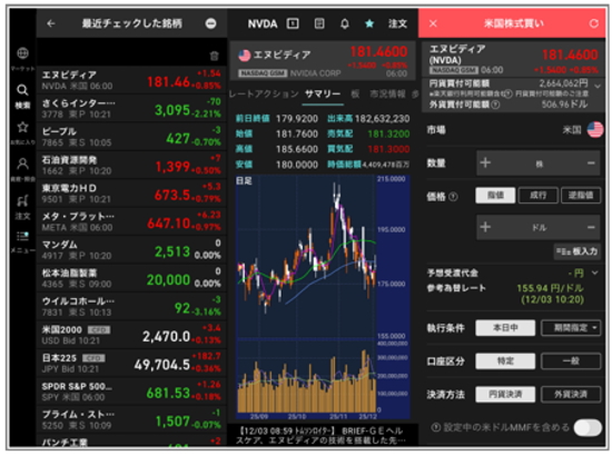 今回の最適化により、iPadでも国内株式に加え、米国株式、「かぶミニ(単元未満株取引)」、CFDの取引が可能となる。プロ投資家も利用する「アルゴ注文」や、「フル板」上での板発注機能「武蔵」に対応するほか、銘柄情報、チャート、注文画面など最大3つの情報を一画面に自由に配置できる。画面遷移を抑え、分析から発注までを効率的に完結できる点が特長である。