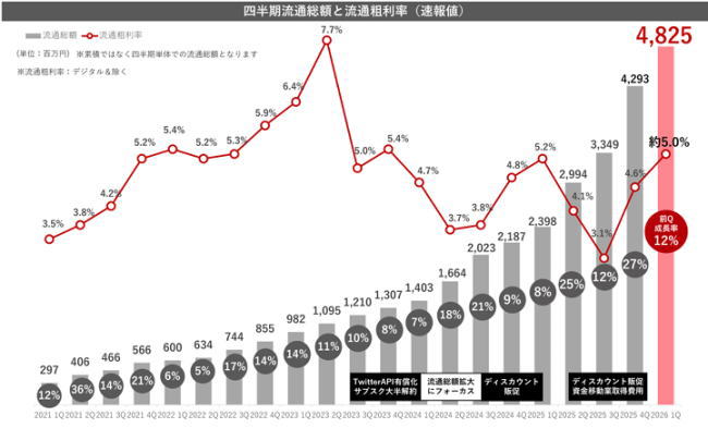 同社は2026年9月期の中間目標として掲げる「月間流通総額35億円」の早期達成を最優先課題に据える。第1四半期は一時的な成長鈍化を見込んでいたものの、想定を上回る水準で推移した。デジタルギフトは2025年9月期第4四半期から投資回収フェーズに移行し、流通粗利率は5.0%水準となった。一方、資金移動業サービスの立ち上げ初期には、流通拡大を優先するため粗利率が一時的に低下する見込みだ。