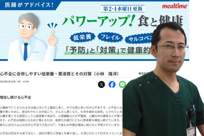 同社は、フレイル・サルコペニアを予防し、健康寿命の延伸を目的とした食生活について、医師が解説するWebメディア「パワーアップ!食と健康」を運営している。第69回は小林隆洋先生が執筆した。小林先生は信州大学医学部を卒業後、長野県内の総合病院で循環器内科に従事し、2020年から現在は長野厚生連南長野医療センター篠ノ井総合病院に勤務している。また、長野県内のサルコペニア・フレイル指導士を中心とした多職種の集まりである「信州サルコペニア・フレイル研究会」を結成し、啓発活動にも取り組んでいる。