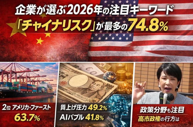 帝国データバンクは1月16日、企業を対象に実施した「2026年の注目キーワード」に関するアンケート結果を発表した。最も多く挙げられたのは「チャイナリスク」で、回答企業の74.8%に達した。台湾問題や日中関係、対中依存などへの懸念が背景にあり、海外取引の有無を問わず地政学リスクを強く意識する企業の姿勢が浮き彫りとなった。