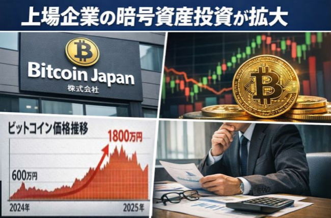 ビットコイン価格は、2024年1月に1BTC=600万円前後で推移していたが、乱高下を経て2025年10月には一時1800万円超まで上昇した。こうした価格高騰を背景に、短期間で高い売買差益を得られる点が暗号資産投資の魅力とされる。一方、幕末創業の和装卸だった堀田丸正(株)は、2025年11月に社名をBitcoin Japan(株)へ変更し、AI関連分野とビットコイン投資を新たな柱に掲げた。長期の業績不振を打開する狙いが透ける。