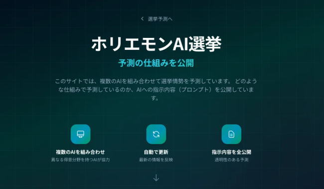 ホリエモンAI学校は1月29日、2026年に実施予定の衆議院議員総選挙に向けて公開している「ホリエモンAI選挙」について、選挙予測の仕組みを明らかにした。複数のAIを活用して選挙情勢を分析・予測する取り組みで、AIへの指示内容であるプロンプトを公開する点を特徴とする。