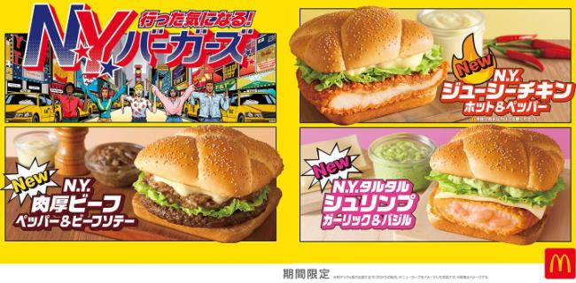 「N.Y.肉厚ビーフ ペッパー&ビーフソテー」は、100%ビーフパティにペッパーの効いたビーフフィリングとレタスを組み合わせた食べ応えのある一品だ。「N.Y.ジューシーチキン ホット&ペッパー」は、ザクザク衣の食感が特長のチキンパティにスイートレモンソースを合わせ、「N.Y.タルタルシュリンプ ガーリック&バジル」は、ぷりぷりのえびカツとガーリック・バジルのタルタルソースが相性の良い仕上がりとなっている。いずれも特製の四角いバンズを使用したスタイリッシュな見た目が特長だ。価格は単品で400円から790円、バリューセットで600円から1,090円。販売期間は3月上旬までを予定する。