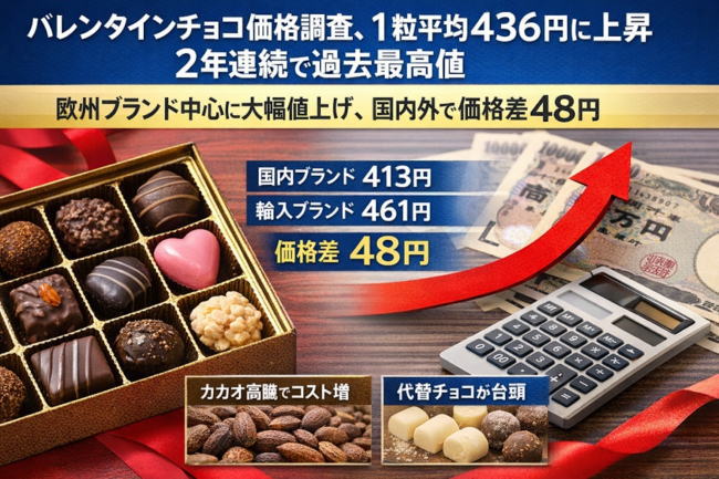 帝国データバンクは2月3日、2026年バレンタインシーズンに発売されるチョコレート価格の調査結果を発表した。全国の百貨店やショッピングモールなどに展開する155ブランドを対象に調査したところ、1粒当たりの平均価格は436円となり、前年の418円から18円(4.3%)上昇した。2年連続で400円を超え、調査開始以来の最高値を更新した。