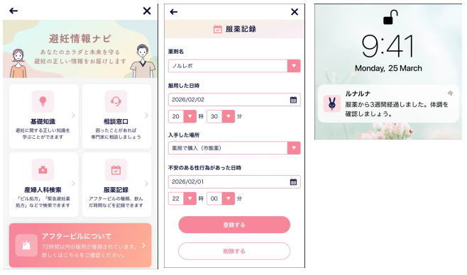 また、同日より『ルナルナ』アプリにおいて、緊急避妊薬の服薬後の体調確認をサポートする機能を追加した。ユーザーが服薬情報を記録すると、3週間後に通知が届く仕組みで、内容はプライバシーに配慮されており、安心して利用可能。薬局で処方箋なしに購入できる緊急避妊薬「ノルレボ®」の販売開始を背景に、必要な情報と手段へのアクセス強化を図る取り組みである。