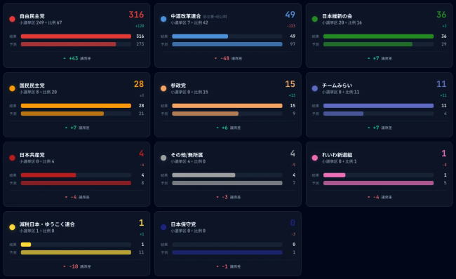 ■自民は予想比43議席増、中道は48議席減と大きな乖離