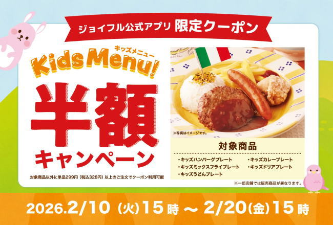 同キャンペーンでは、人気のキッズメニュー5品を対象に、何度でも利用できる半額クーポンをアプリ上で配信する。対象は小学生以下の子どもで、クーポン1回の提示で対象商品を複数注文できる。利用条件として、同一伝票内で半額対象商品以外に単品299円(税込328円)以上の注文が必要となる。期間中に新たに公式アプリをインストールした利用者にもクーポンを配布する。
