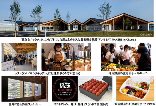 同施設はAIなど先端技術を活用するアグリテックとユニバーサルなワークフローを導入した6次化農業の拠点である。サンゴ砂礫農法によるミニトマトを月2トン、野菜ファクトリーでレタス約220キロを生産し、首都圏スーパーやECで販売する。館内製造の総菜や野菜を使用した弁当は冷凍技術を活用し全国13都府県へ販路を拡大した。