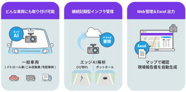 同サービスは、国土交通省中部地方整備局の「道路異常箇所の自動抽出・事故損傷箇所を判別する技術」に関する技術試行に選定され、札幌市との実証を通じて精度向上を進めてきた。既存車両にエッジAI端末を取り付けるだけで日常走行を点検データ化し、同一地点を時系列で比較可能とする。事故前後の状態把握や補修優先度判断、損害賠償の裏付け資料としての活用も想定する。