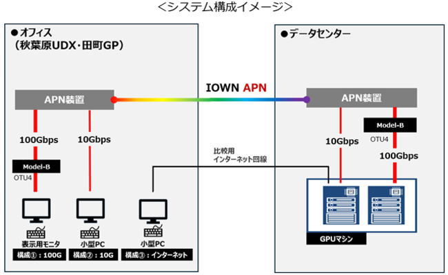 近年、建設・設計分野のBIM活用やゲーム・映像分野の高度映像処理、製造業におけるAI活用など、高度な計算資源を必要とする業務が拡大している。一方、GPUマシンなどの高性能機器をオフィス内で運用するには、電力消費や発熱対策、設置スペース確保などの設備負担が増大している。こうした課題に対し、IOWN APNによる超低遅延・高速通信を活用し、データセンターに機器を集約してオフィスから遠隔利用する構成の有効性を検証した。