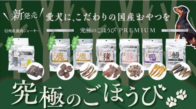 同商品は、開発者が「より多くのワンちゃんに味わって欲しい」との思いから、素材には野趣あふれる信州産の鹿肉をはじめ、猪肉などのジビエを採用した。鹿肉チップスや鹿肉スペアリブ、イノシシ肉ジャーキーなどのジビエ系に加え、豚の肺を使ったキューブ、京鴨の手羽先、さらにはうなぎの頭といった多様なラインアップを揃える。