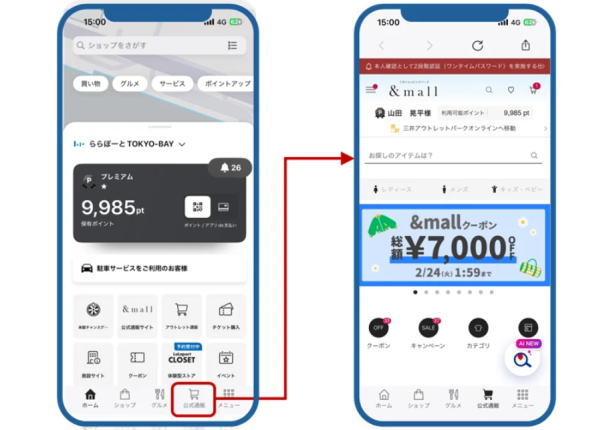 同アプリは、「三井ショッピングパーク ららぽーと」「三井アウトレットパーク」などの商業施設と、公式通販サイト「&mall」「三井アウトレットパーク オンライン」をつなぐオムニチャネル戦略の中核として機能している。アプリ内に「公式通販」タブを追加し、施設とECを行き来しやすい設計としたことで、店頭で見た商品を後日オンラインで購入するなど、リアルとオンラインを横断した購買行動を後押しし、アプリ経由でのEC利用者数は前年比2倍以上に増加した。