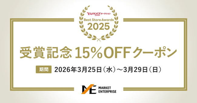 マーケットエンタープライズ<3135>(東証スタンダード)は、「Yahoo!オークションBest Store Awards 2025」(主催:LINEヤフー)において、約21,000ストアの中から総合賞第1位に選出された。昨年度に続く2年連続の受賞を記念し、2026年3月25日(水)から3月29日(日)までの5日間、同社ストア内の商品が15%OFFとなる「受賞ストア限定クーポン」を配布する。