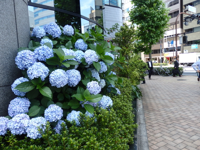 梅雨入り宣言を「冷淡」にはねつけるような初夏の陽が照りつける茅場町ビジネス街のど真ん中。アルカリ性の土には紫色、酸性土なら赤色といわれる。本来、株の街には赤い色が、お似合いだが、このところの軟弱相場を映しているのか、紫色がやけに鮮やかだ。しかし、『七変化花』ともいわれることから、赤色に変身、相場活況も期待されるのではないだろうか。