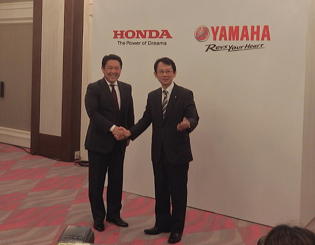 ホンダ<7267>(東1)とヤマハ発動機<7272>(東1)は5日夕方、日本国内の50CC原付スクーターや電動2輪車を含めた「原付一種」領域での協業に向けた業務提携について検討を開始したと発表した(写真:左からホンダの青山信二取締役執行役員、ヤマハ発動機の渡部克明取締役常務執行役員)。