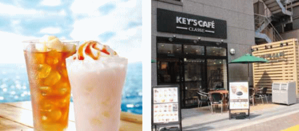 キーコーヒー<2594>(東1)が提案するパッケージカフェ「KEY’S CAFE」では、「ピーチスムージー&シトラスピーチティー」を夏季限定メニューとして販売する。