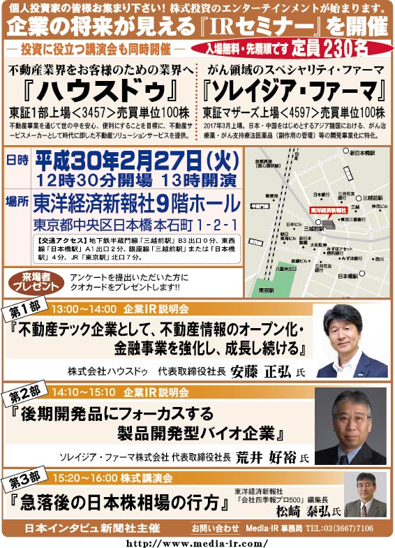2月27日(火)は、第1部で東証1部上場・株式会社ハウスドゥ(証券コード=3457)代表取締役社長・安藤 正弘氏がIR講演会を行う。第2部で東証マザーズ上場・ソレイジア・ファーマ株式会社(証券コード=4597)の代表取締役社長・荒井 好裕氏がIR講演会を行う。第3部では東洋経済新報社「会社四季報プロ500」編集長の松崎泰弘氏が株式講演会を行う。