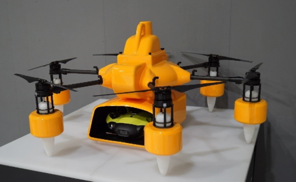 機体は、スマートドローンプラットフォームの活用により、船を出すことなく、点検場所までドローンが自律飛行し、着水後に水中ドローンを分離し、遠隔で水中の点検が可能となる。